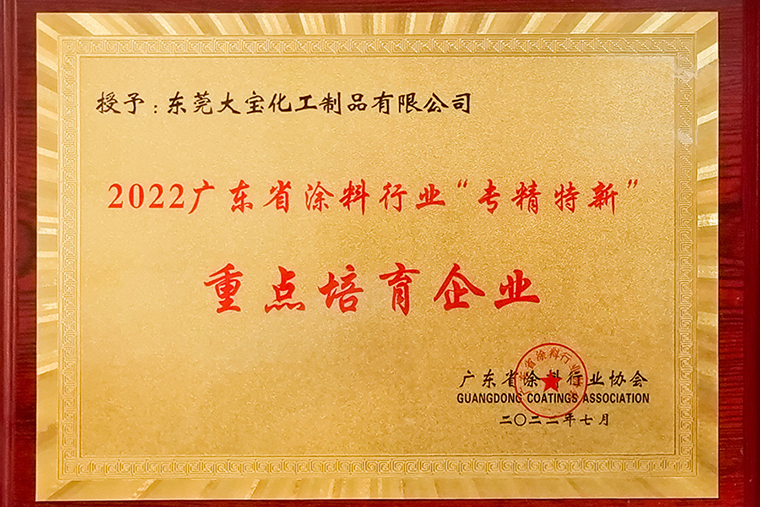 東莞大寶化工制品有限公司獲得2022年廣東省涂料行業(yè)協(xié)會(huì)“專精特新”重點(diǎn)培育企業(yè)獎(jiǎng)。